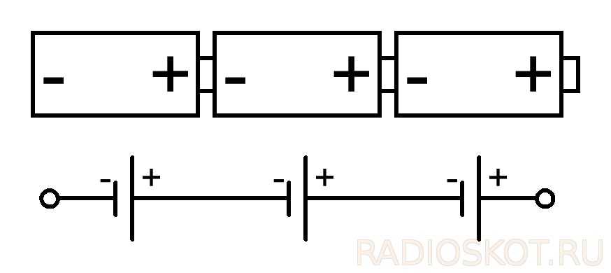 Часто напряжения, даваемого одним гальваническим элементом, недостаточно. Тогда их можно соединять последовательно в батареи.