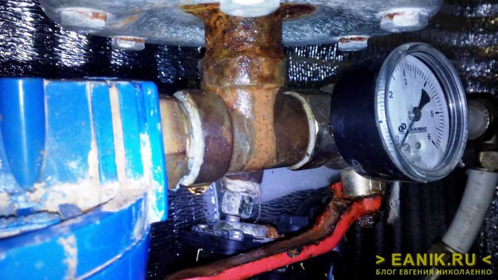 Прорыв произошел в самом неожиданном месте, а именно на фланце гидроаккумулятора в районе штуцера. Хоть производители и пишут, что фланцы изготавливаются из нержавеющей стали, но они все же ржавеют со временем Высокое содержание растворенного железа в воде, конденсат и, видимо, некачественные материалы сделали свое дело. Гарантия на бак составляла 5 лет, но он не отработал и 4. Кстати, электронный блок управления от этой системы вышел из строя на втором году эксплуатации и был заменен на обычное механическое реле давления той же фирмы.