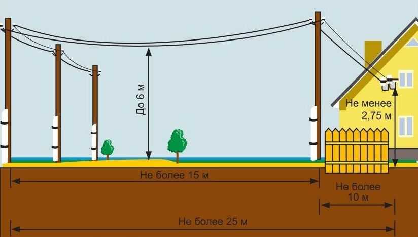 Наиболее рациональным воздушный ввод может оказаться тогда, когда расстояние между стеной дома и столбом электроснабжения не превышает 20 м. Если оно оказывается большим, то на приусадебном участке придется устанавливать еще одну дополнительную опору.