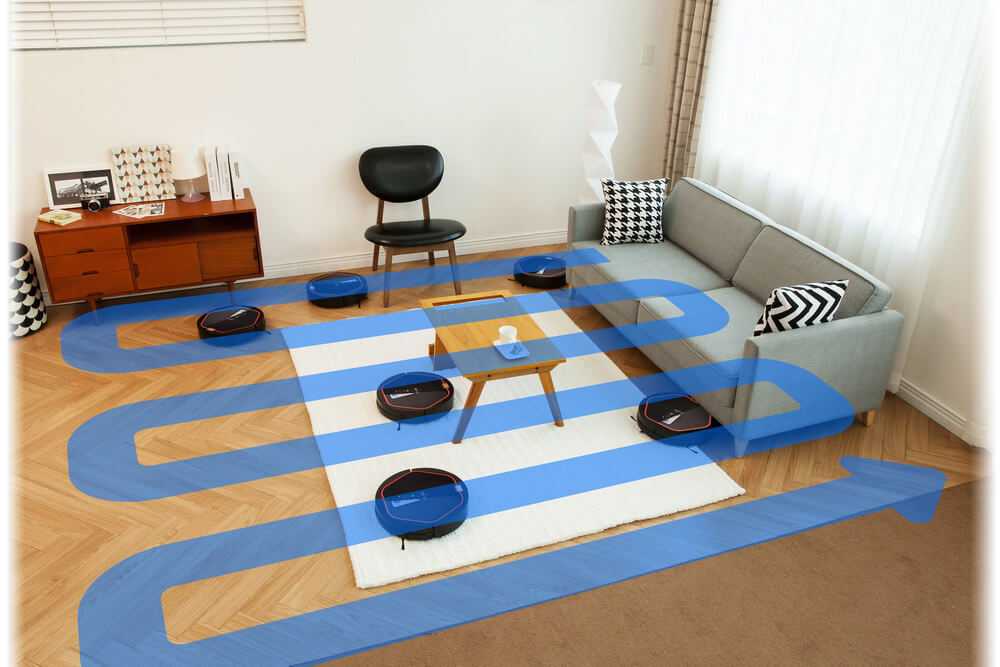 - В авто-режиме робот двигается по помещению змейкой, самостоятельно выбирая направление перемещения, а также запоминает место нахождения базы. Робот-пылесос, пройдясь по квартире один раз, самостоятельно направлется на базу для подзарядки.