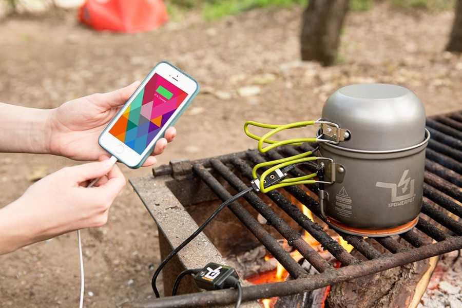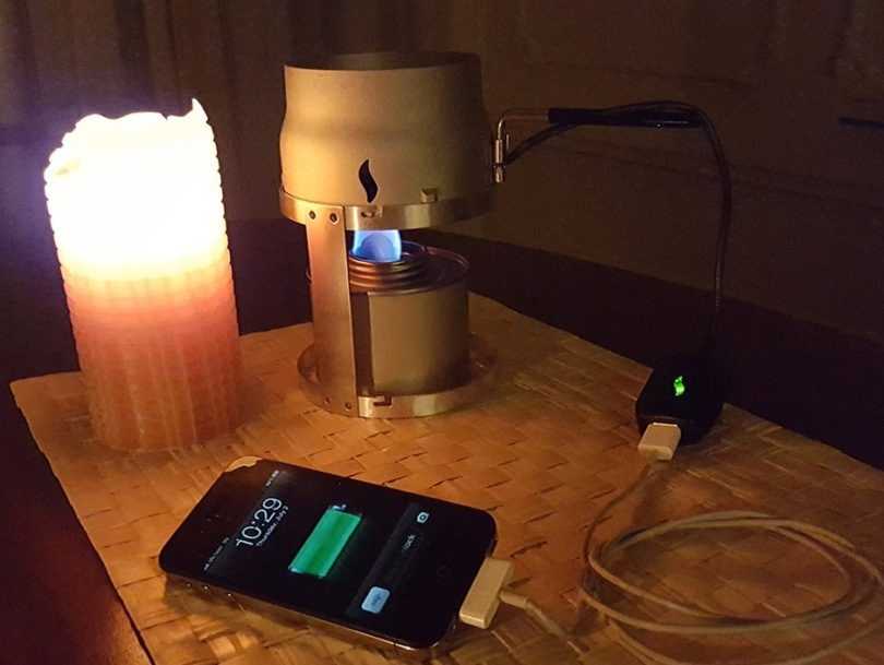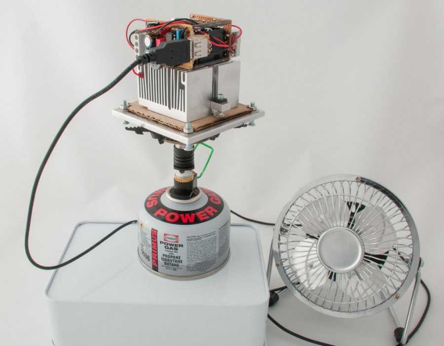 Работает термоэлектрический генератор следующим образом: внутри печи засыпаете дрова, поджигаете их и ждете несколько минут, пока одна из сторон пластины не нагреется. Для подзарядки телефона нужно, чтобы разница между температурами разных сторон была около 100оС. Если охлаждающая часть (радиатор) будет нагреваться, его нужно остужать всеми возможными методами – аккуратно поливать водой, поставить на него кружку со льдом и т.д.