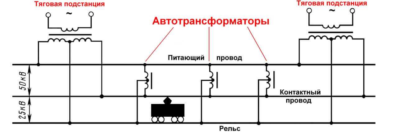 Например, на ЖД используются такие изделия в сетях 2х25 (два по 25 киловольт). Как на схеме выше в малонаселенных районах прокладывается линия 50 кВ, а к электропоезду по контактному проводу подаётся 25 кВ от понижающего автотрансформатора. Таким образом уменьшается число тяговых подстанций и потери в линии.
