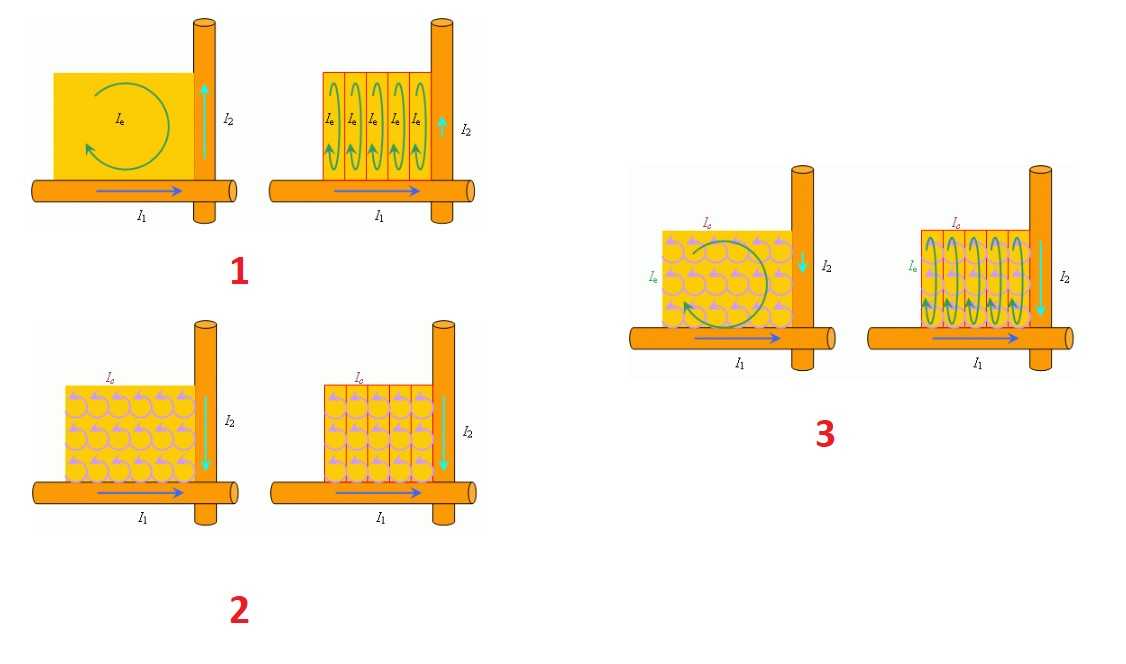 На рисунке можно хорошо рассмотреть, как интересующие нас токи увеличиваются при повышении уровня индукции (показаны пунктирными направляющими) в середине катушки, которая подключена к переменному току.