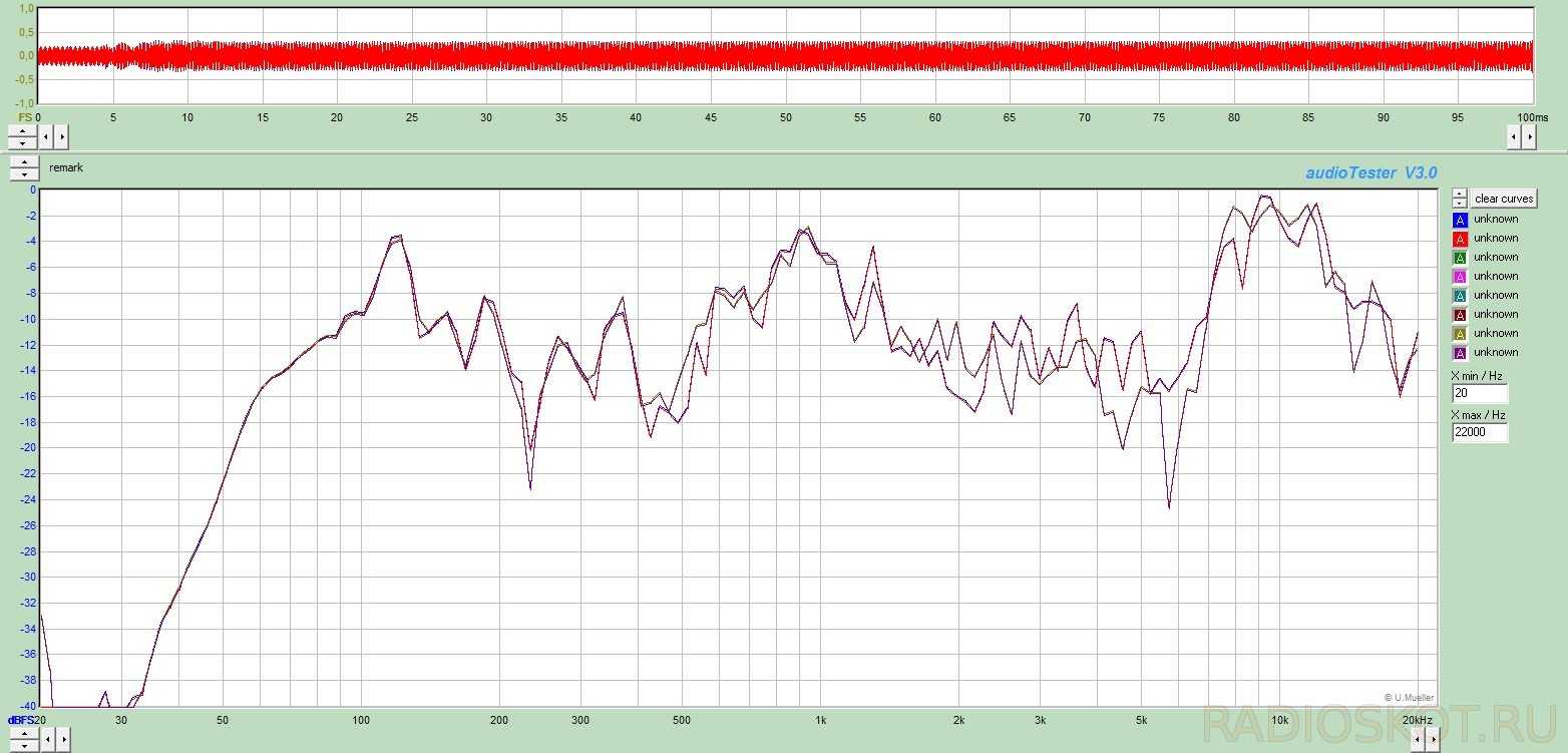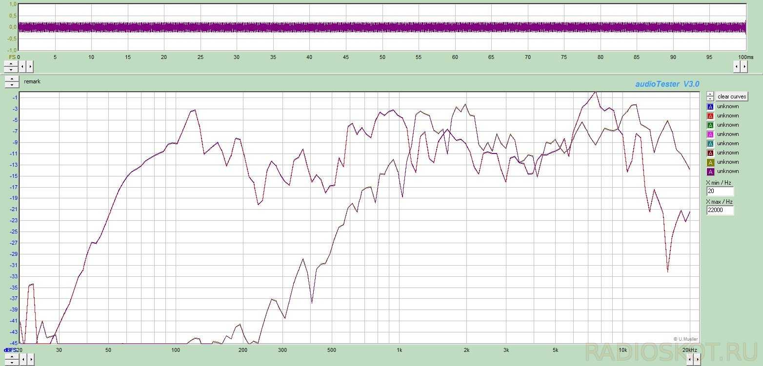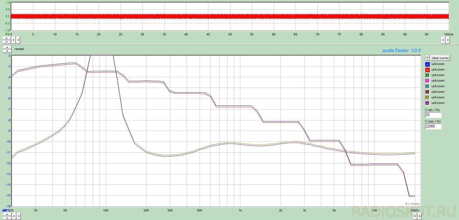 Когда с примерными параметрами все более или менее ясно, самое время переходить к практике. Снимаем импедансную характеристику динамиков. С целью оценки сопротивления на графике имеется лесенка с шагом в один Ом. Скачек на 110 герцах это переключение с 10 Ом на 20.