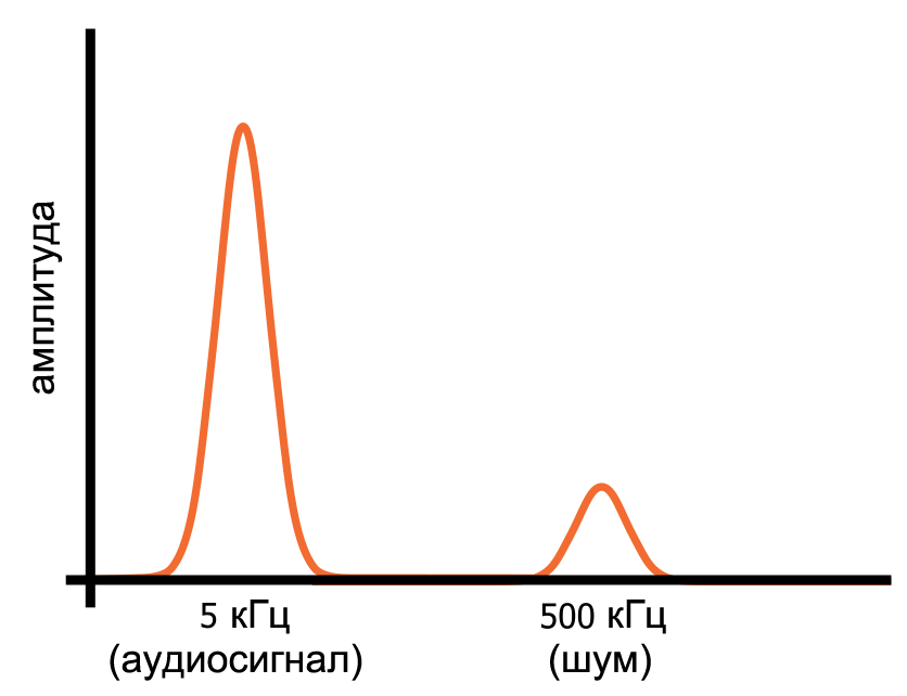 Давайте представим, что у нас есть аудиосигнал, который состоит из идеальной синусоидальной волны 5 кГц. Мы знаем, как выглядит синусоида во временной области, а в частотной области мы не увидим ничего, кроме частотного «всплеска» на 5 кГц. Теперь предположим, что мы включили генератор на 500 кГц, который вносит в аудиосигнал высокочастотный шум.