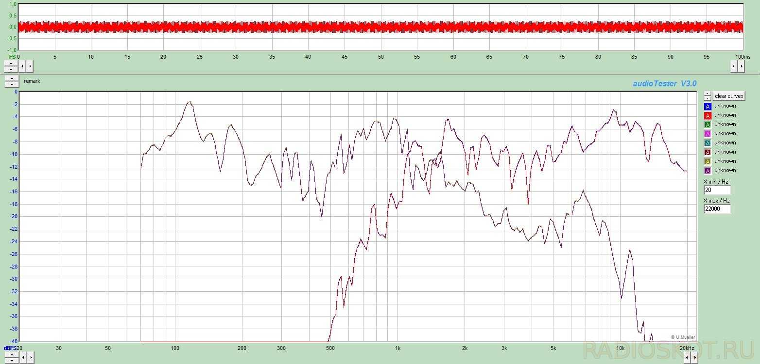 Итак, смотрим какие уникальные динамики нам достались. Высокочастотник начинает валить с 1,3 кгц, значит ниже его пускать нельзя. С другой стороны низкочастотник пытается играть по самые 10 кгц, с переменным успехом. Однако здравый смысл подсказывает, что выше килогерца его пускать плохая затея. И что спрашивается делать, если рабочие диапазоны динамиков не пересекаются?