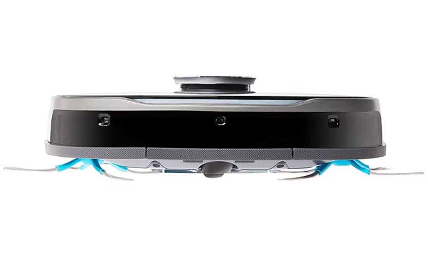 Перевернем гаджет и рассмотрим, что у него расположено снизу. Там есть две боковые щетки, работающие независимо друг от друга. Кнопка вкл/выкл, приводные, дополнительное и поворотное колеса. Встроен датчик высоты, чтобы устройство не падало со ступенек или высоких порогов.
