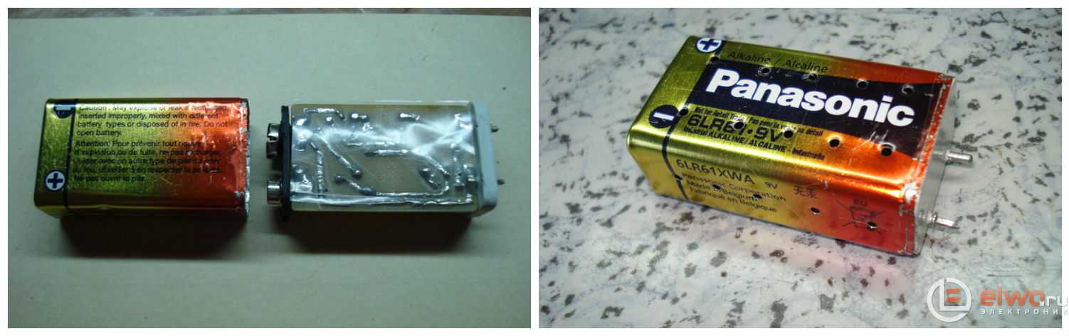 — к батарейке припаяны удлиняющие проводники и они соедены со штатными клеммами подачи питания на мультиметр;
