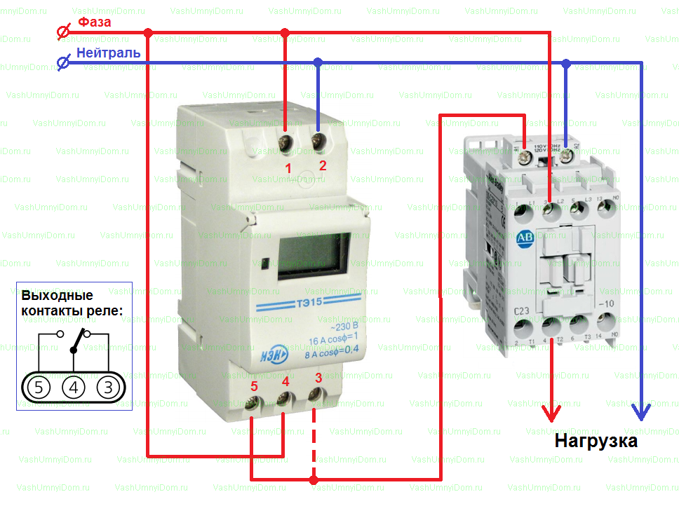 Если реле времени используется для контроля работы более мощной нагрузки, например, электродвигателя, понадобится подключение магнитного пускателя.