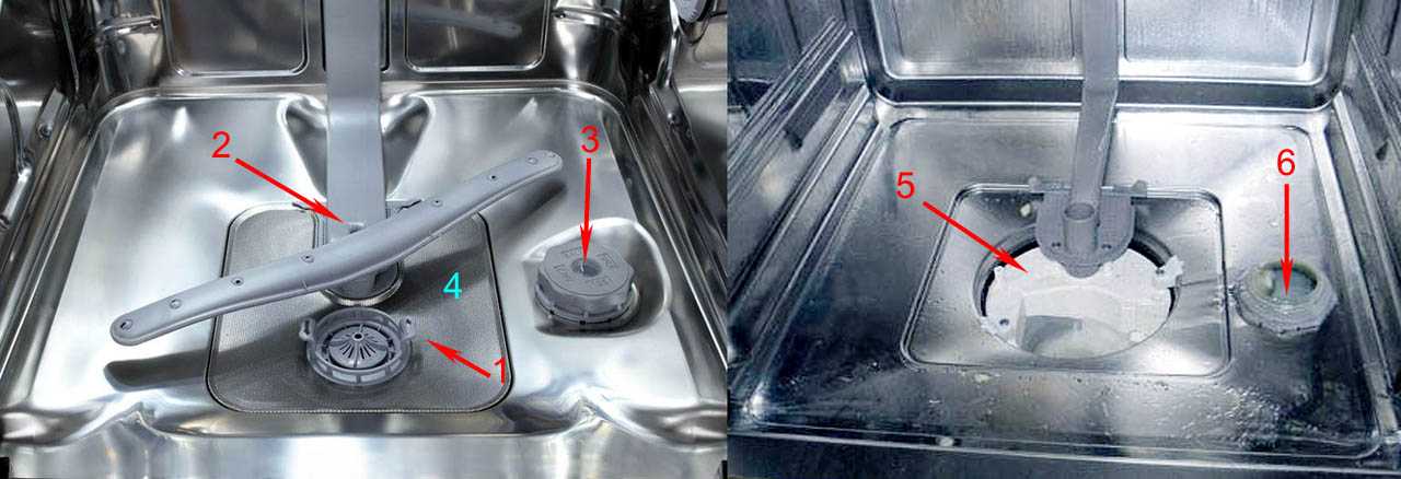 Откройте дверцу своей посудомойки. Вы увидите нечто вроде того, что показано слева на рис. Первое, что тут можно сделать – повернуть по стрелкам и вынуть фильтр ванны 1. Далее, после отвинчивания винта 2 или тоже с проворотом, снимается нижнее коромысло (верхнее аналогично). Справа в моечной камере – регулятор уровня воды, управляющий безо всякой электроники поплавковым клапаном. Ручку установки уровня можно снять, отвинтив винт 3. Когда вынут фильтр и снято нижнее коромысло, вынимается без инструмента поддон моечной камеры 4. Сразу под ним (см. справа на рис.) обнаруживается крышка крыльчатки помпы 5, а при снятой ручке установки уровня воды виден шток поплавкового клапана 6. Его ход можно проверить, надавив пальцем, но для ремонта или замены всего клапана нужно будет снять правую панель корпуса, или весь его целиком.