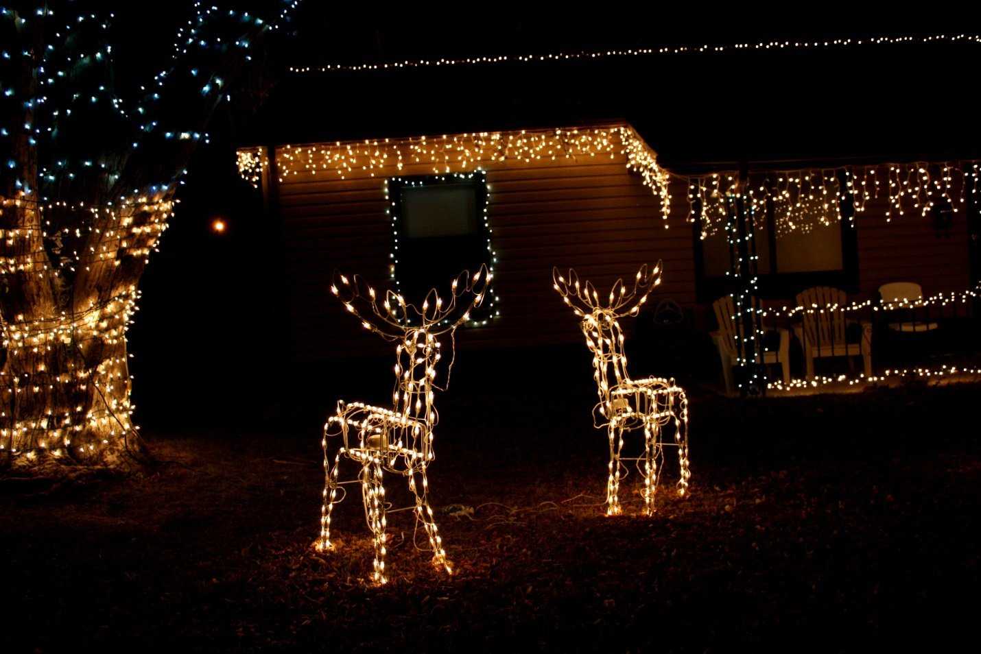 Ими можно полностью обматывать деревья или же использовать для стилизации фасада: располагать над оконными проемами, по периметру крыши. Для деревьев также могут использоваться гирлянды в виде тонких палок со светодиодами внутри.