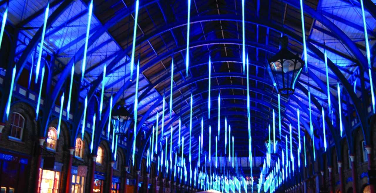 Крупной гирляндой капли дождя в исполнении для наружной установки можно украсить фасад коммерческого объекта
