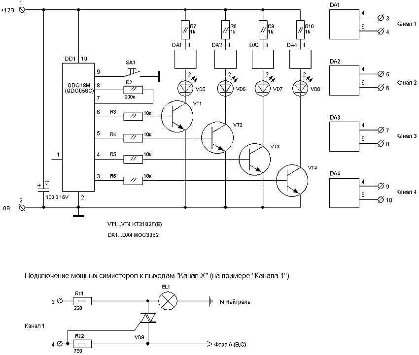 На рисунке приведена реализация блока на основе типовой микросхемы. Встроенная память «прошивается» в фабричных условиях. Пользователь меняет режимы последовательно нажатием кнопки SA1. Для большего числа компонентов и соответствующего увеличения мощности отдельных каналов применяют соответствующие ключи – симисторы.