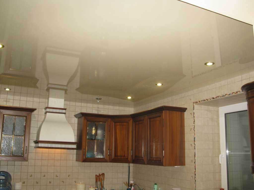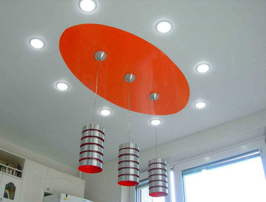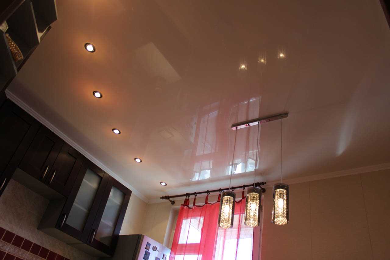 Дополнительная подсветка обеденной либо рабочей зоны на натяжном потолке с помощью точечных светильков — один из приемов, позволяющий создать в этом помещении особое настроение и уют.
