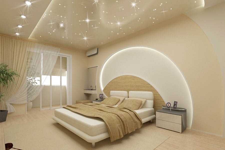 Часто в спальне и вовсе можно ограничиться одними софитами на натяжных потолках. Хороший совет — используйте желтый свет. Он не такой яркий, как классический белый, и никогда не вызовет у вас раздражения.