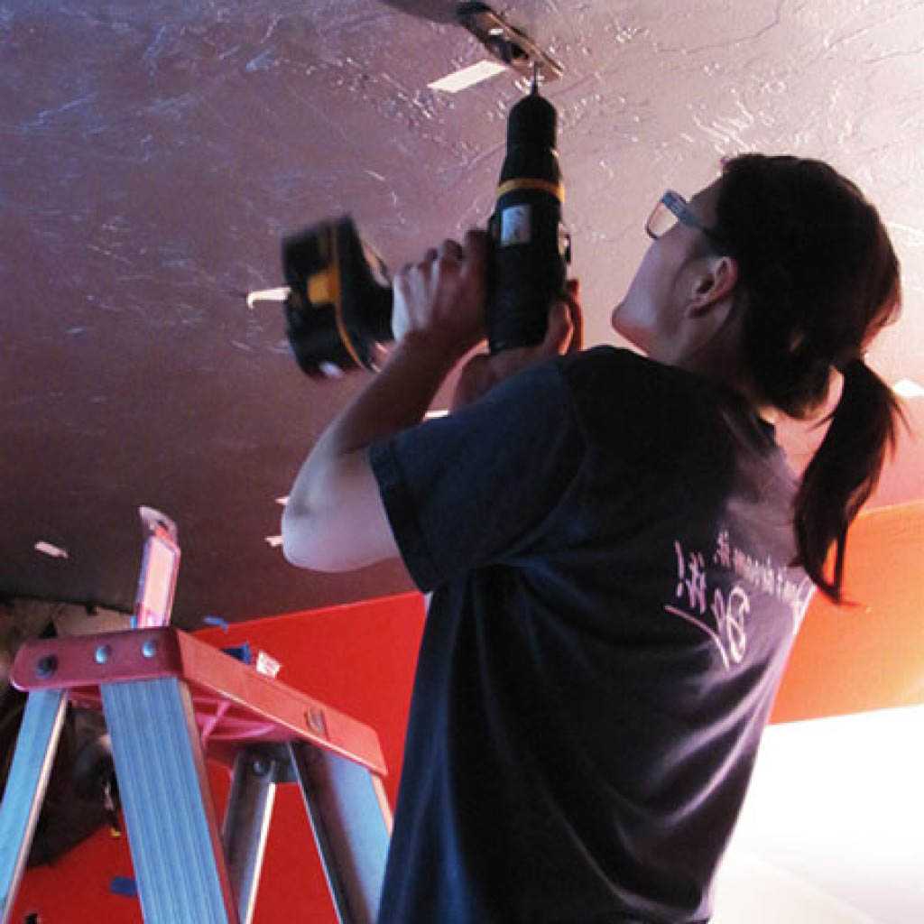Шаг 1. Если уровень потолка опускается незначительно, для монтажа светильника на небольшой продольной планке достаточно закрепить в нужном месте потолка закладной брусок. Делают это так: сверлят в бруске два отверстия диаметром 2-3 мм. Для того чтобы уложить провода, по центру бруска выпиливают неглубокий паз. Размечают потолок и высверливают отверстия перфоратором, после чего крепят брусок и укладывают в него провода.