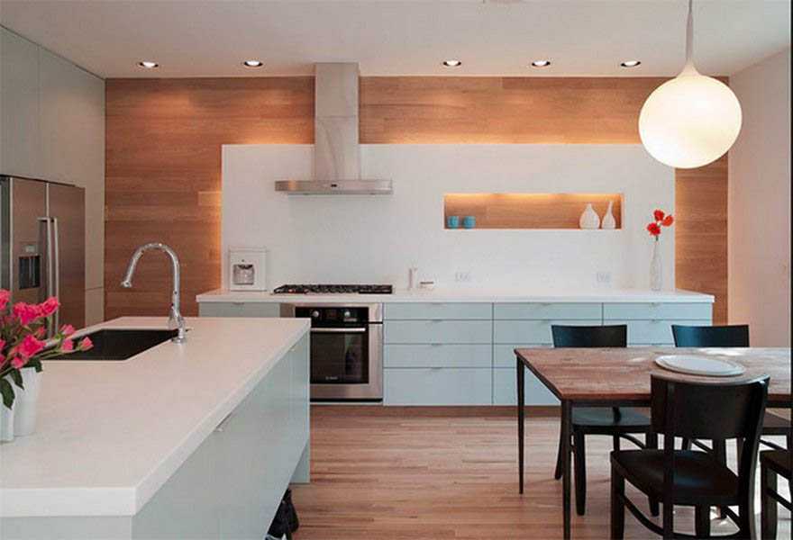 В остальном софиты на кухне часто располагаются вдоль установленного гарнитура — в этом варианте есть какая-то традиционность, но очень часто обусловленная скромными размерами кухни в целом. И, как следствие, совсем небольшим пространством для маневров.