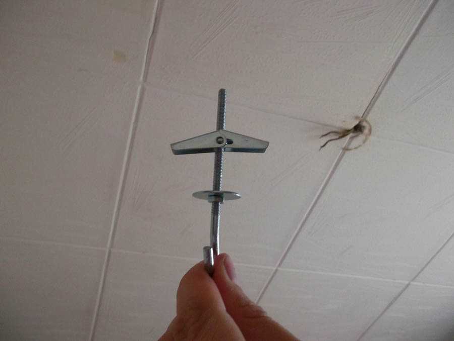 2. Если осветительный прибор тяжелее 4,0 кг, то технология будет другой. В этом случае нужно использовать особые анкерные болты (d>=10,0 мм.кв.) с распорочным крюком. Совершив высверливание нужного канала, необходимо ставить в него анкер и затянуть его до предела. Теперь, светильник будет надёжно располагаться под потолком.