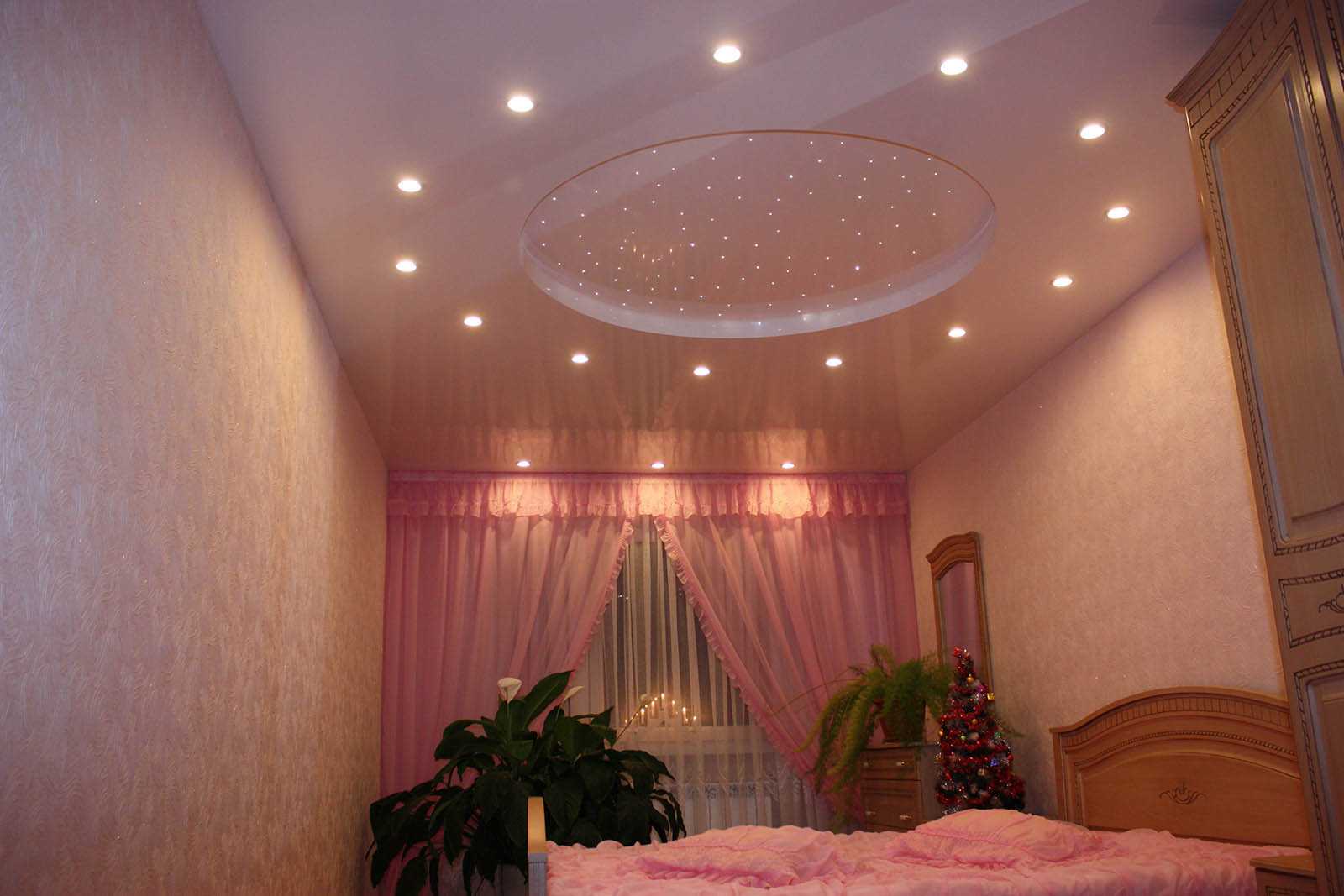 Впрочем, есть и довольно оригинальные способы расположения спотов на натяжной потолке — на фото ниже.