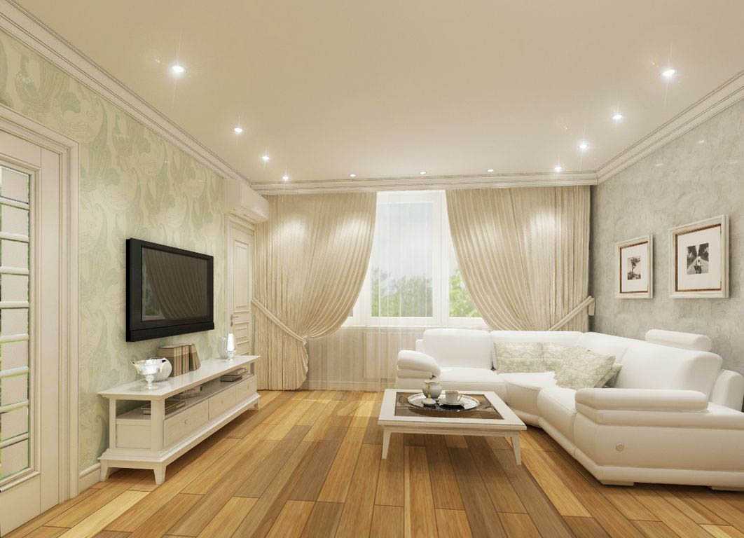 Большие гостиные можно успешно делить на зоны. Выбранная схема расположения точечных светильников на натяжных полотнах чаще всего будет зависеть от стиля оформления интерьера. Для минимализма, получившего сейчас особую популярность, более всего актуальна строгая геометрия и симметричность. Для классики — некоторая сглаженность углов.