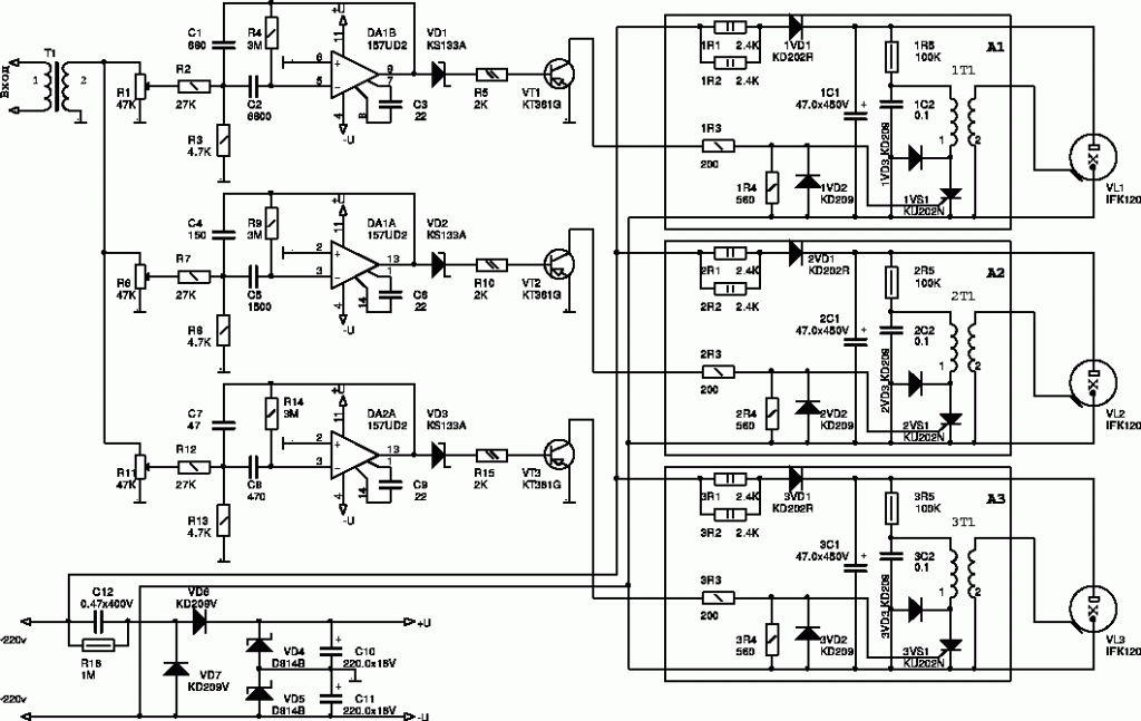 На рисунке ниже показана схема цветомузыкальной установки, работающая с 3-я различными светильниками. При этом мощность прожекторов доходит до 100 Вт каждая.