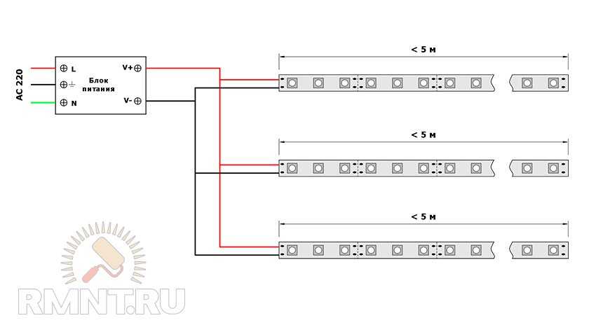 Схема прямого подключения светодиодной ленты. Несоклько лент подключаются параллельно к одному источнику тока