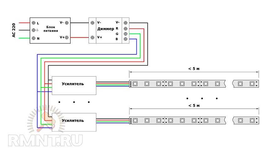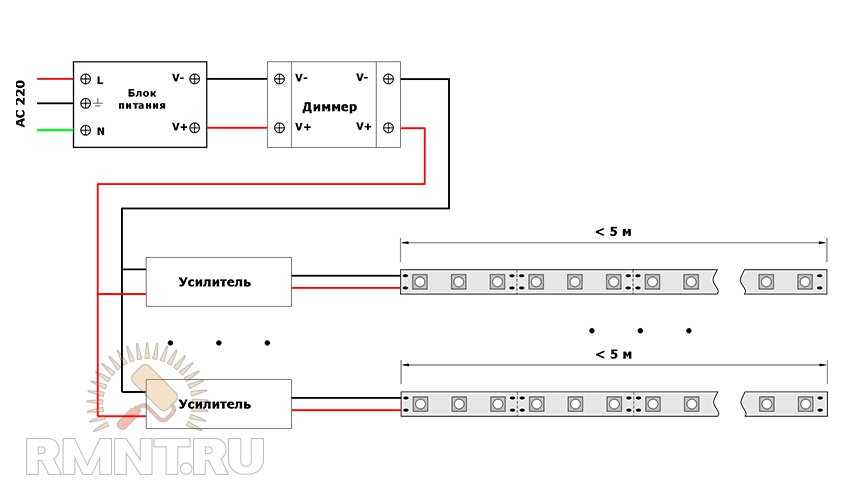 Несоклько светодиодных лент, включенные с использованием диммера или ШИМ-контроллера, должны подключаться с помощью усилителя