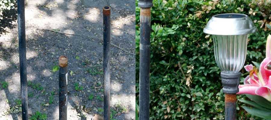 В качестве стоек используют обрезки водопроводных труб, которые часто лежат без дела после завершения ремонта. Конструкцию фонаря окрашивают при помощи аэрозольной краски.