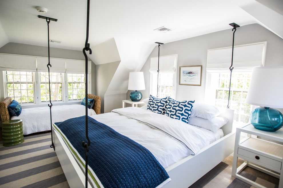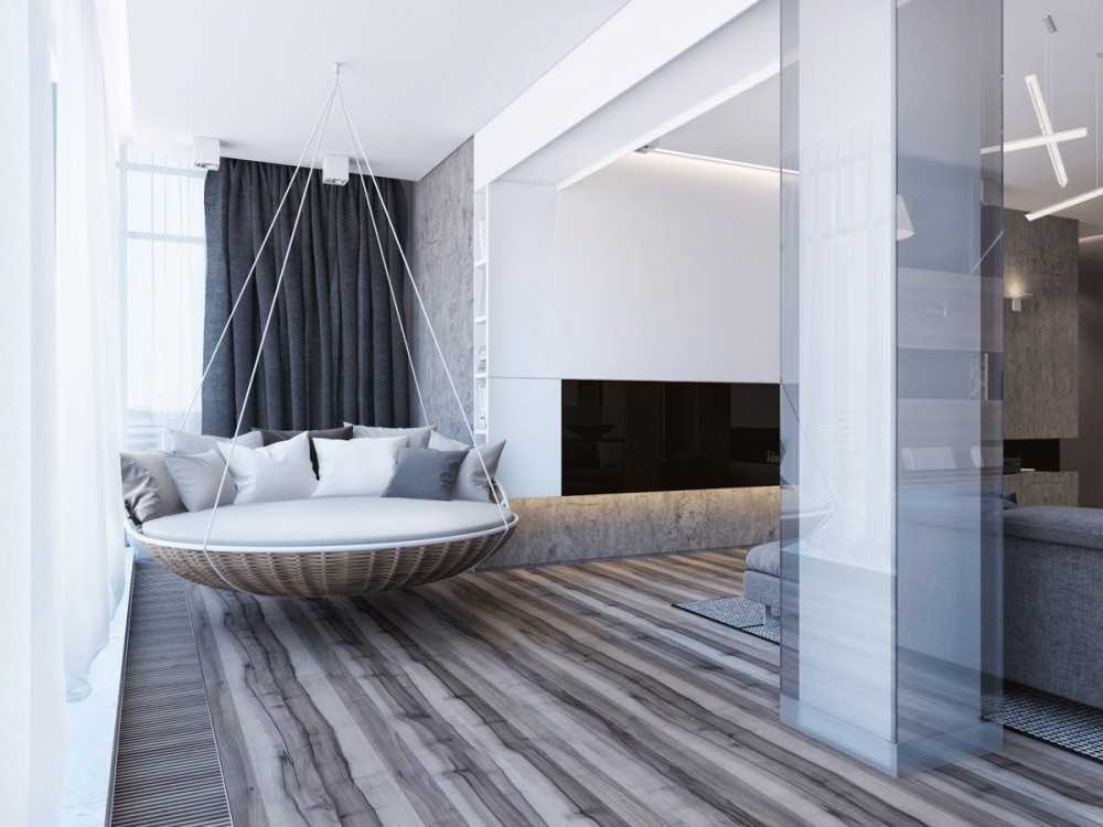 - Подвесная. Про подвесную кровать у нас был отдельный и достаточно подробный материал. Крепится к потолку и стенам, раскачивается, возвышается над уровнем пола без опоры. Оригинально, но на такое решение осмелится не каждый;