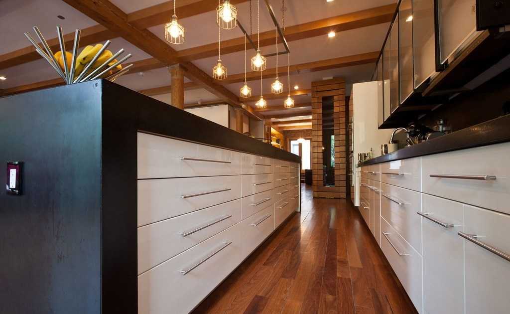 Рабочая зона кухни требует дополнительной подсветки. Свисающие с потолка лампы Эдисона создадут необходимый уровень освещенности и оживят интерьер.