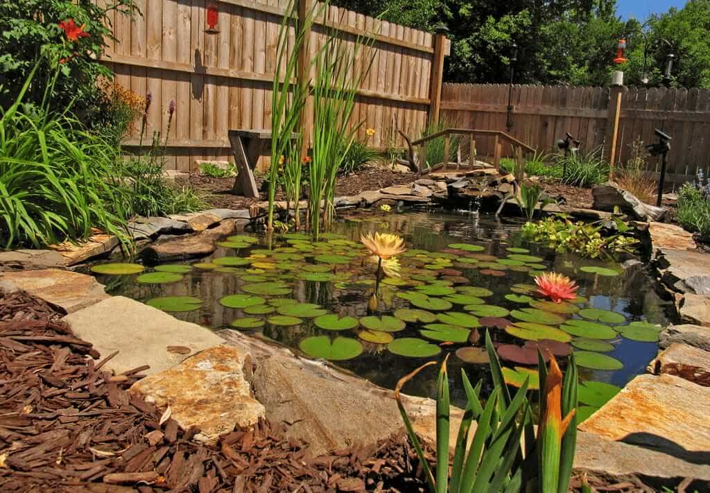 Для декоративного небольшого пруда достаточно выкопать яму любой формы и застелить ее двойным слоем пленки, обеспечив достаточно надежную гидроизоляцию. Берега укрепляют кирпичами, галькой или небольшими булыжниками.