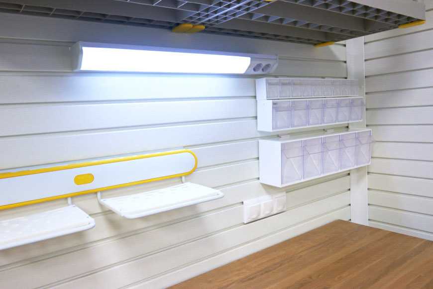 - При наличии слесарного стола или верстака над ним целесообразно установить отдельный элемент освещения, направленный на поверхность стола, передвижное точечное освещение и группу розеток для подключения электроинструмента.