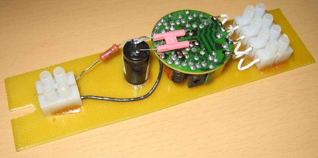 Альтернативой описанным способам является использование платы от энергосберегающих ламп. Фактически это тот же ЭПРА, что используется с трубчатыми аналогами, но в миниатюрном формате.