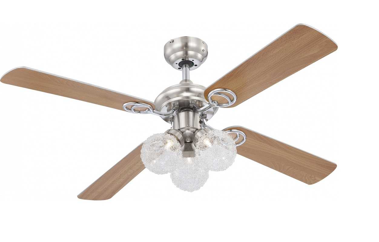 Модель 78525WES представляет стиль модерн. Конструкция лаконична, 3 плафона сочетаются с 3 лопастями, применяются галогенные лампы.