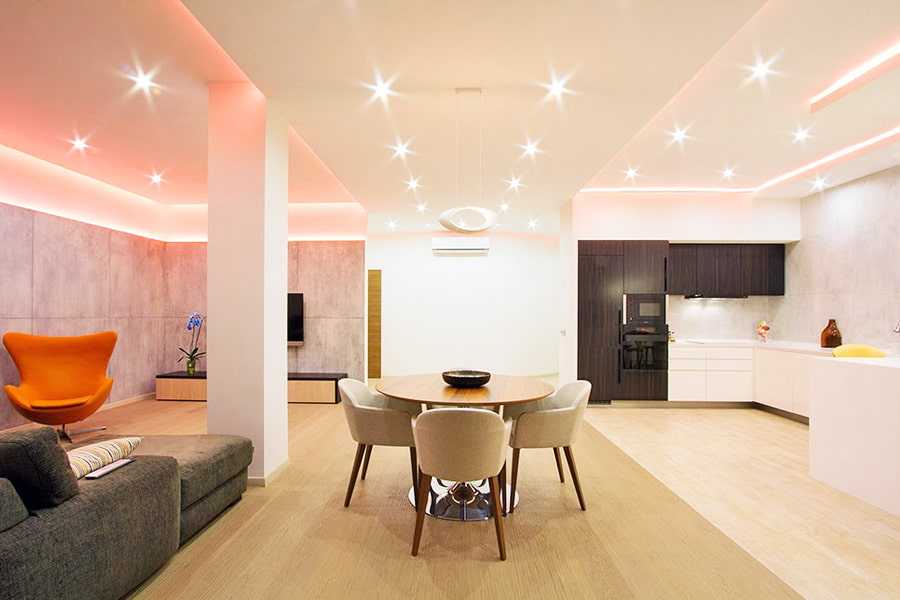 Если в таких комнатах, как спальня, точечное освещение можно использовать по минимуму, то для зала о таком варианте можно напрочь забыть.