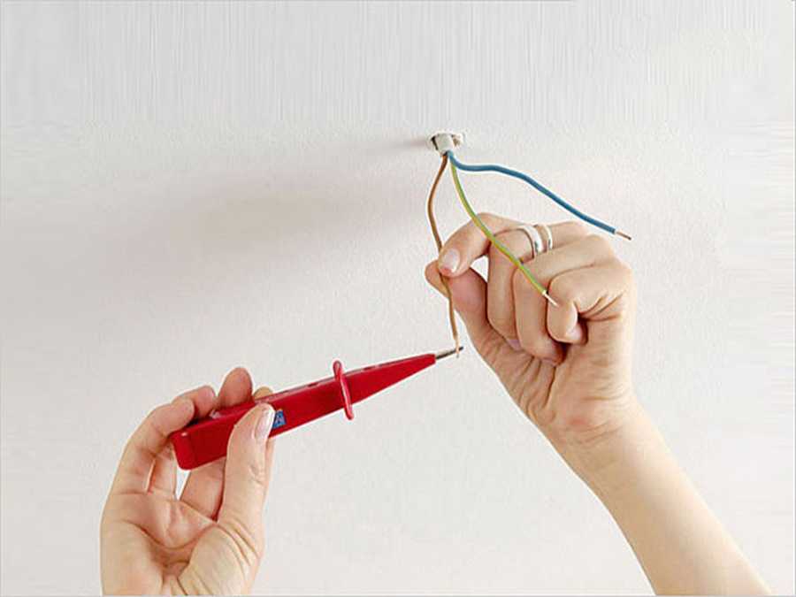 Дальше нужно найти ноль и фазу. Они могут быть любого цвета. Для этого нам понадобится обычная индикаторная отвертка. Сначала нужно отвести концы проводов друг от друга на безопасное расстояние и перевести клавишу выключателя в положение «включено». После этого прикоснуться индикаторной отверткой к каждому из проводов. При прикосновении к фазе она будет светиться, при прикосновении к нулю — нет.