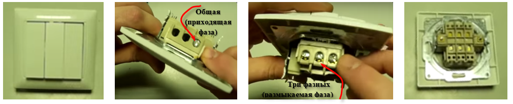 С другой стороны, трехклавишный выключатель позволяет сделать дом значительно комфортней. С его помощью вы сможете разделить свое помещение на несколько освещаемых зон. Край клавиши прижимается пальцем к стене в положении выключено, другой, выступающий край подцепляется ногтем или плоской отверткой и тянется на себя. Три других жилы — к трем клеммам выключателя, находящимся напротив общего контакта с одного конца, и каждая жила на фазную клемму своего осветительного прибора одного из трех с другого конца кабеля.