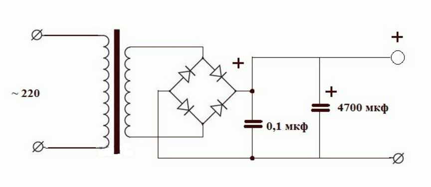 Лица, имеющие представление об электротехнике, могут изготовить самодельный блок питания. Схема его довольно проста и включает понижающий трансформатор, диодный выпрямитель и два конденсатора. Все детали можно купить или взять из старой радиотехники. Подойдет трансформатор от лампового телевизора с выходом 24–30 В. Наличие выпрямляющего диодного моста обязательно. Конденсаторы применяются недефицитные, от старой техники: один на 0,1 мкф и другой электролитический на 4700 мкф.