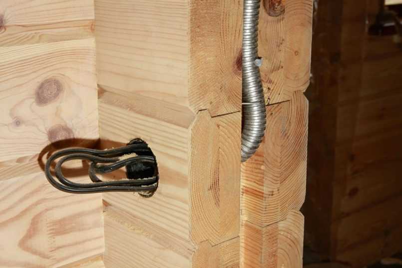 Ну и последний из вариантов крепления – в деревянной стене. Если Вы решили провести скрытую проводку в деревянном доме, что очень странно и небезопасно, нужно будет сделать штробы в дереве под установку металлических подрозетников.