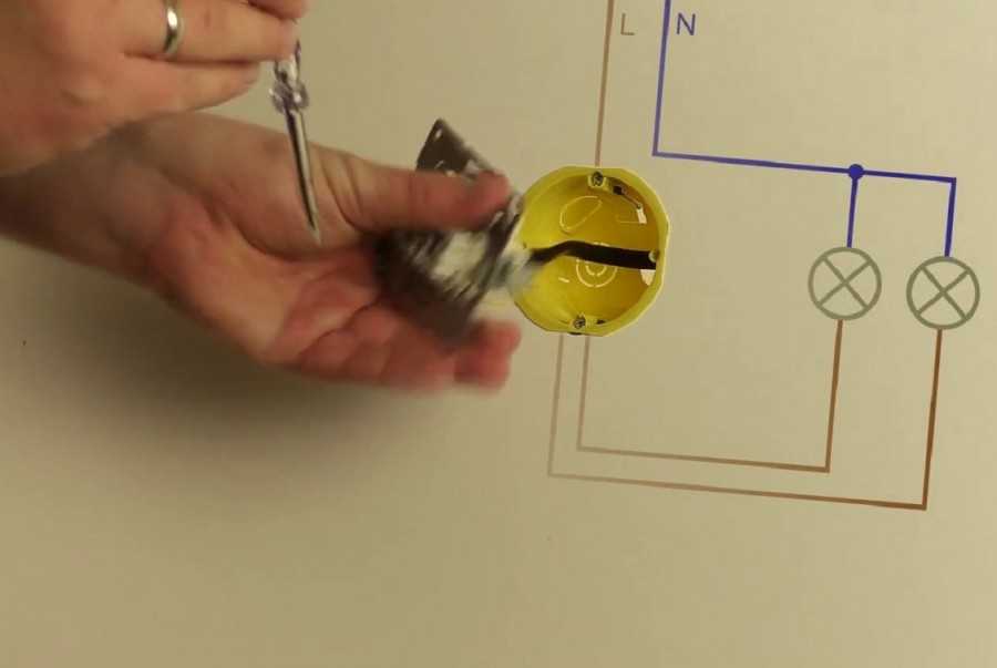- Устанавливается распределительная коробка, в которую заводят от имеющейся розетки провода (предварительно надо провести обесточивание помещения), жилы, идущие на выключатель, и провод от светильника.