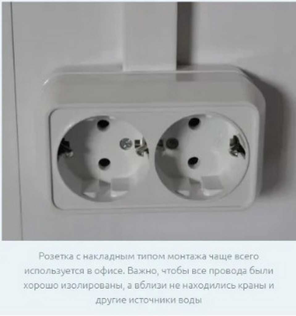 Накладные розетки используют при наличии наружной прокладки проводки, устанавливается на саму стену. Монтировать этот вид устройства не сложно, так как не нужно делать большое углубление в стене. Недостатком можно читать то, что конструкция заметно выступает от стены, подобный вариант не всегда удобен.