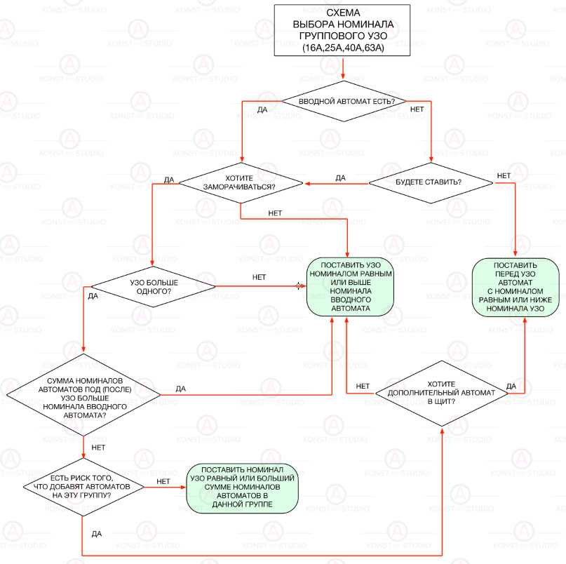 Если вы окончательно запутались в этих расчетах, можете воспользоваться удобной мнемосхемой подбора УЗО от KonstArtStudio.