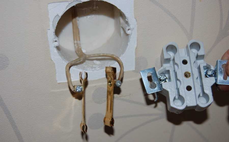 Перед тем как крепить монтажную коробку, в него нужно завести провод. Далее деталь помещается в углубление и фиксируется. У большинства моделей имеются держатели (лапки), которые при закручивании соответствующих винтов расходятся в стороны, упираясь в стенки ниши.