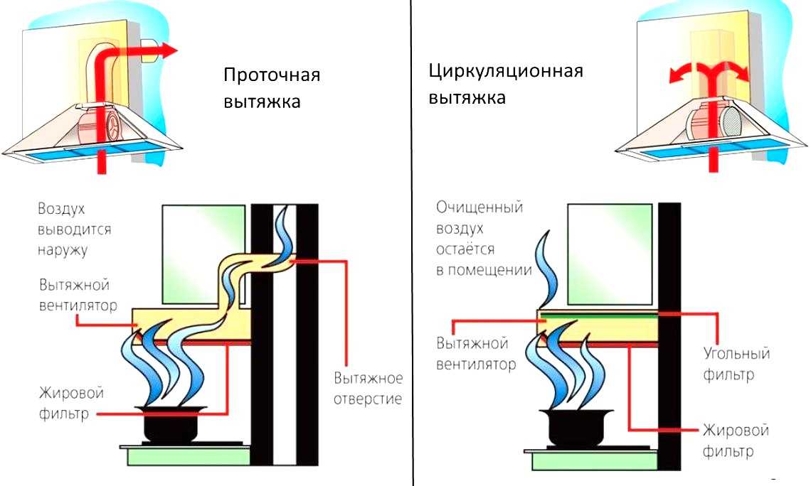 Рис. 2. Отличие рециркуляционной вытяжки от проточной |