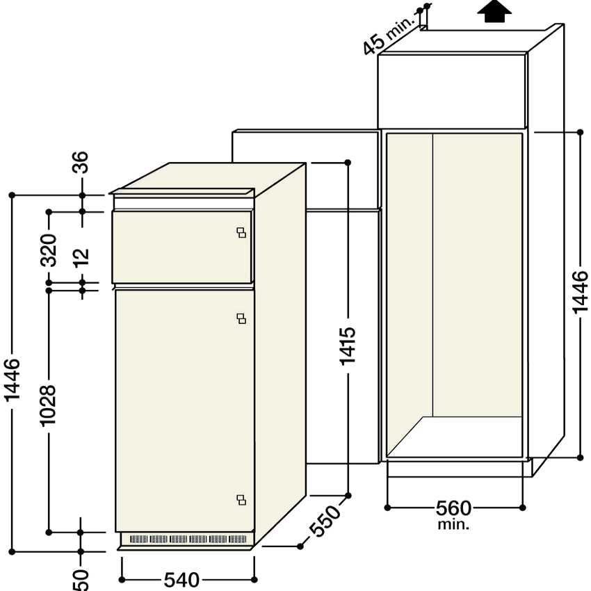 устанавливается в вертикальные колонны/модули со встроенным холодильником. Вертикальный профиль для холодильника увеличивает габариты по ширине и требует дополнительную фальш панель с видимых сторон.