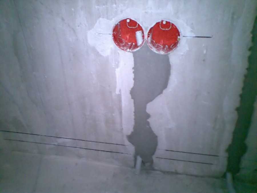 - Подготовить в стене круглые отверстия (со штробами под электропровода), размер которых будет соответствовать диаметру подрозетника.