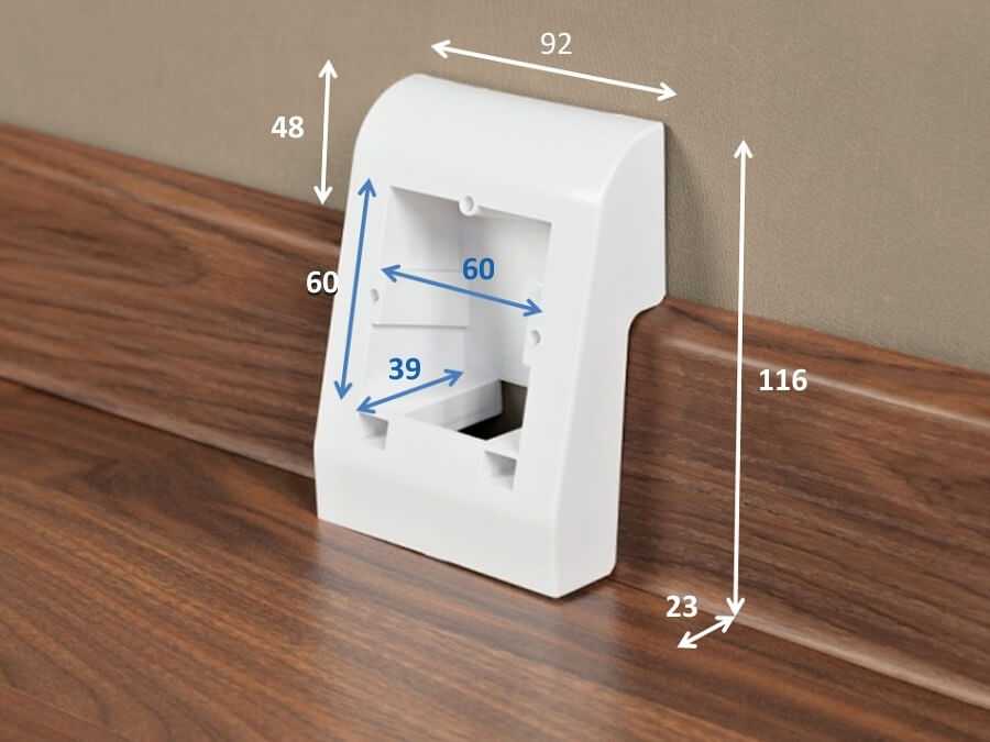 Габариты квадратных подрозетников отличаются, в зависимости от производителя. Чаще всего используют размер 70*70 мм, однако могут быть и 60*60, как показано на фото ниже: