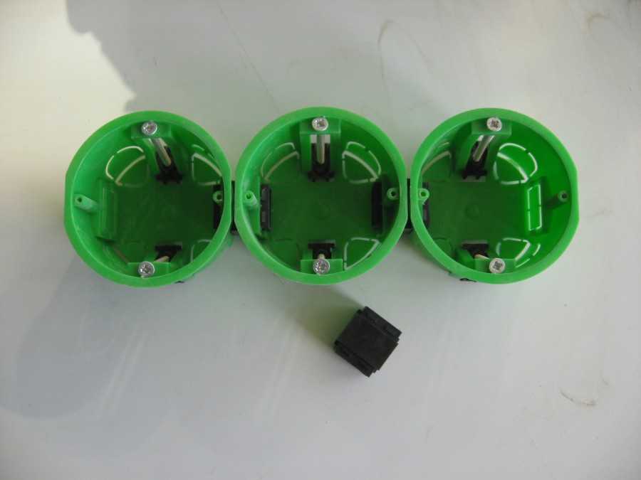 - Несъемные элементы в конструкции подрозетника — соединительные тоннели. Они есть в каждой модели оборудования. Это позволяет соединять в блоки коробки, при наличии такой необходимости. Минус у подрозетников такого типа один — те элементы соединения, которые не эксплуатируются, необходимо удалять, причем, делать это нужно механическим способом. А удалять их нужно по той причине, что они могут стать помехой в процессе установки блока либо отдельно взятой коробки