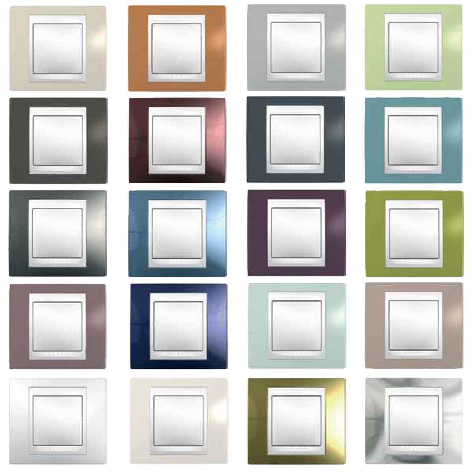 Важно отметить, что рамки New Studio могут заменяться на классические рамки Unica. Цветов и комбинация стало еще больше: 4 цвета кнопок и 16 видов рамок