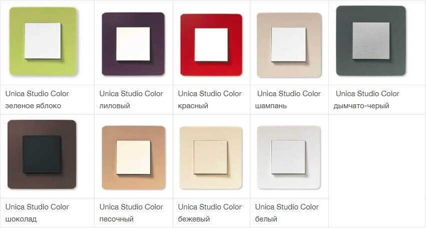 Важно отметить, что рамки New Studio могут заменяться на классические рамки Unica. Цветов и комбинация стало еще больше: 4 цвета кнопок и 16 видов рамок